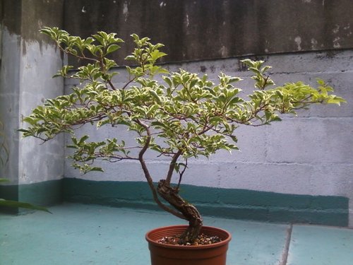 幾個瞎子通過摸象來以了解象的樣子,由於每人所摸的形狀不同,對其形容亦 不同,故為此而爭論不休。(出自大般涅槃經卷32),意指觀事物時只看片面, 以偏概全。 不管學歷職業地位高低您同不同意我們對於人事物的認定大多數情況是在瞎子摸象,習慣以自我的經驗認知觀點與習慣來看世界。以數目字10來說,如問其可能組合馬上會想到0/10-1/9-2/8-3/7-4/6-5/5等組合,但如再開放正負數與小數點呢? 如不問清楚題目其他條件就堅持答案是2/8,那大家是否為此而爭論不休呢?相同的,引起發燒或肚子痛的原因很多,您覺不覺得,急診醫生與門診醫師問診態度差很大,前者常會問東問西甚至再加驗血驗尿,後者卻常聽完病患敘述後不發一語的埋頭打電腦2-3分鐘就打發,後者開的藥您吃得放心?(常要跑幾次才能對症) 種了幾年九重葛「瞎子摸象」四字是我的心得,以葉子出現焦黑情況來說,藥/肥/水/雨/風/菌,是何因造成?(均有可能) 您問兩個人恐怕會有三種不同答案,多出來的一種是因那人很盡責也有持續的研究與學習發現後主動更正的,但是如問的人有告知:品種/有無施肥其種類數量頻率/如何澆水/有無淋雨/症狀在新葉或老葉全面或局部/新苗或老樹/放室內室外/有無寒流風吹,定能能獲得較正確診斷。這幾年經常有之前認為對的後來才知道那只是在特定情況下才是的感覺,覺得事情沒那麼簡單,懂的往往只是皮毛。知道我要表達意思後,提醒您下次要問別人品名或問題時,記得要提供更多的資料與圖片,莫要別人摸象您當真。下圖:荒皮土種接銀邊白,再於上/左/右各垂直接金葉紫