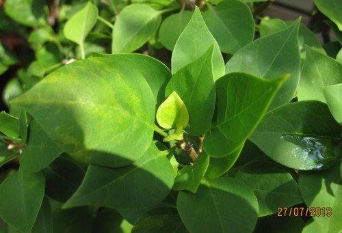 從吳媽媽處得來的光葉粉,子房肥大、可育、光葉及花色,曾認為是formosa(大陸稱巴西丁香紫),上週請二羊兄帶來巴西丁香紫的葉片讓我瞧瞧,不太相同,那這光葉粉是何品遂成迷?是實生苗?下圖這株最下方幾年前出現一小段畸形葉,不很在意它,該剪還是剪,最近看其新出的枝,已能確定不是偶發性之病葉,是真的芽變,同那種綠葉花苞噴點紅花品種一樣的畸形葉子,圖2~3,枝非常細,今天很小心將它接在大密葉紫塔上,這種芽變可觀處不在葉子(畸形病態),在其花苞,花苞可能出現噴點或變畸形